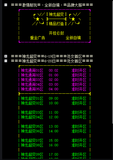 ︱神龙超变01区 09:00 准时开区 ︱=神龙超变|27.25.152.60|17026|$00FF00|SD
